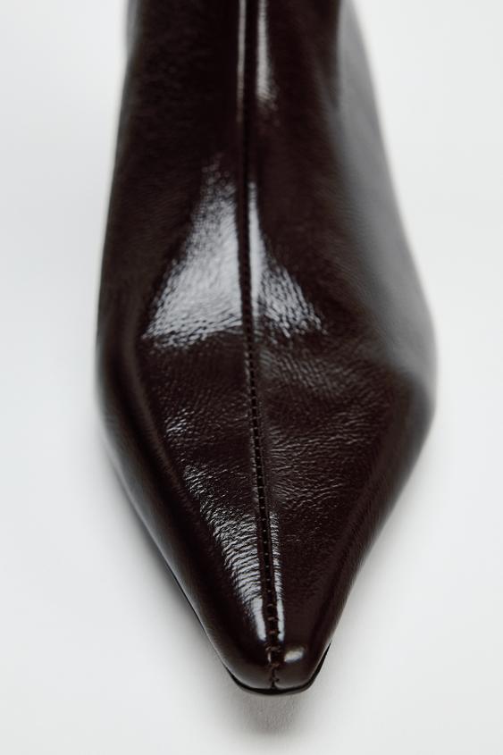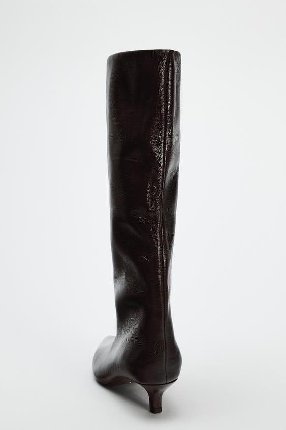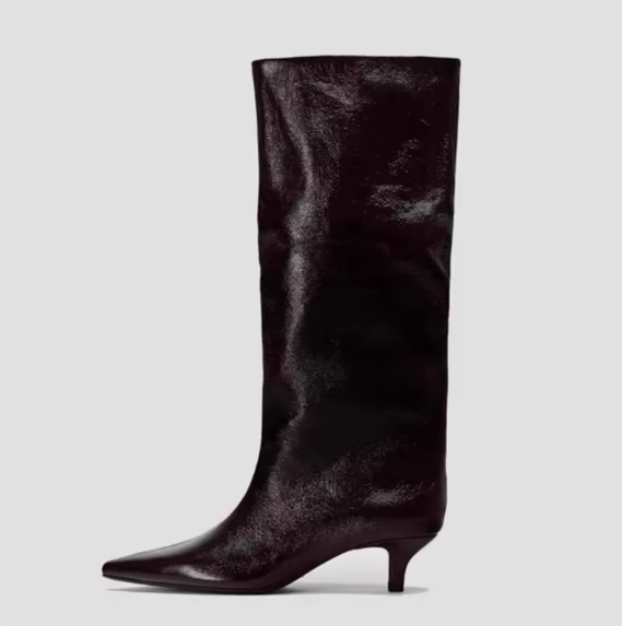 Stivale a gambale largo con effetto verniciato. Tacco kitten. Punta affusolata.
